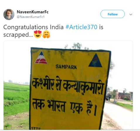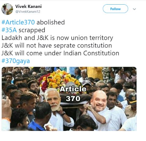 ટ્વિટર પર કેટલાક લોકોએ પીએમ મોદીની એક જૂની તસવીર પણ ટ્વિટ કરી છે, જેમાં પીએમ મોદી ધરણા પર બેઠા હતા અને તેમની પાછળ લગાવવામાં આવેલા બેનર પર લખ્યું હતું કે કલમ-370 હટાવવામાં આવે. ઘણાં લોકો મીમ્સ બનાવીને પણ તેને ફોરવર્ડ કરી રહ્યા છે. લોકોએ કેન્દ્ર સરકારના નિર્ણય પર પોતાની પ્રતિક્રિયાઓ આપી છે. સંસદનું સત્ર શરૂ થયા બાદ ટ્વિટર પર અનુચ્છેદ-370 ટોપ ટ્રેન્ડમાં આવી ગઈ છે.