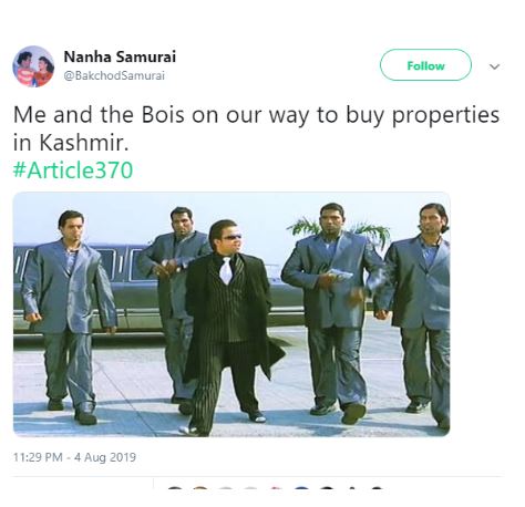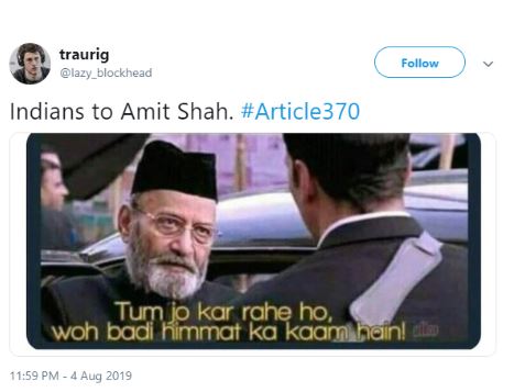 સોશયલ મીડિયા પર લોકો આ નિર્ણયને સારો ગણાવી રહ્યા છે, તો કેટલાક કાશ્મીર પર થનારા પરિવર્તનો જણાવી રહ્યા છે. સોશયલ મીડિયામાં હવે સરકાર જમ્મુ-કાશ્મીર પર આગળ શું નિર્ણય કરશે, તેને લઈને પણ અટકળબાજી કરાઈ રહી છે. આવો હવે જાણીએ છીએ કે સોશયલ મીડિયા પર લોકો આ નિર્ણયને લઈને શું કહી રહ્યા છે. તેને જોયા બાદ તમે પણ ખુદને હસવાથી રોકી શકશો નહીં.