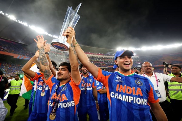 न्यूजीलैंड के खिलाफ 96 रनों की शानदार जीत के साथ सूर्यकुमार की टीम पुरुष क्रिकेट में लगातार दूसरा टी20 विश्व खिताब जीतने वाली पहली टीम बन गई और साथ ही घरेलू मैदान पर ट्रॉफी जीतने वाली भी पहली टीम बनी।