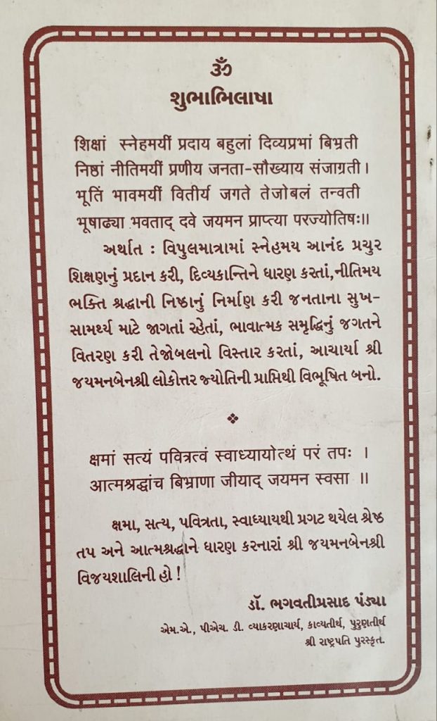 આખાય પુસ્તકમાંથી પસાર થતા એક ભારતીય કર્મઠ નારી ચેતનાના અવિશ્રાન્ત પ્રયત્નોની સુવાસ સ્પર્શે છે. જે સમયમાં ‘ કન્યા કેળવણી ‘ કોઈ જાણતું નહોતું તે સમયે અભાવોની વચ્ચે પણ મણિનગર જેવા વિસ્તારમાં કન્યાશાળાની સ્થાપના કરી. કુદરતી આફતોમાં તેમજ અન્ય આપદાઓમાં સેવા માટે જયમનબહેન તન – મન – ધનથી અગ્રેસર રહ્યા હતા. તેનો એક પ્રસંગ ટાંકવો ગમશે કે તેમણે વર્ષ 1960માં ‘ ભગિની સમાજ’ નામની સંસ્થા સ્થાપી તેના દ્વારા વિવિધ પ્રવૃતિઓ કરતાં હતાં. 1962માં ભારત – ચીન વચ્ચે જે યુધ્ધ થયું હતું તે સમયે જયમનબહેનના નેતૃત્વમાં બધી બહેનોએ ભેગા મળી રૂ. 5000/- રોકડા તથા 75 તોલા સોનુ National Defence Fund માં જમા કરાવ્યા હતા. આવો તો ઘણાં પ્રેરક પ્રસંગો પુસ્તકમાંથી વાંચતા આશ્ચર્ય પણ થાય છે કે, આવું થઈ શકે !? હા, જયમનબહેને કર્યું છે. તેમની ‘ભાવાંજલિ’ ની તો શું વાત કરું !? શાળા દ્વારા ‘ભાવાંજલિ’