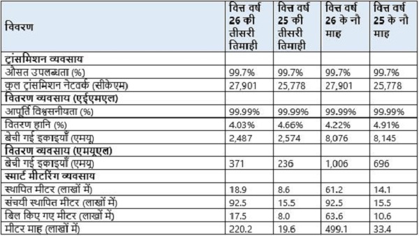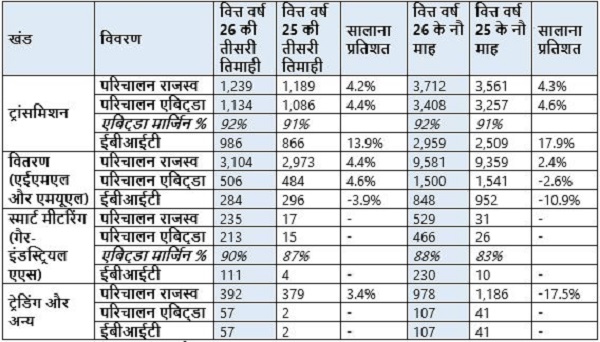 - वित्त वर्ष 26 की तीसरी तिमाही में समेकित परिचालन एबिट्डा 1,802 करोड़ रुपए रहा, जिसमें 13.6% की वृद्धि हुई। यह बढ़ोतरी ट्रांसमिशन, डिस्ट्रीब्यूशन और स्मार्ट मीटर, सभी सेगमेंट में स्थिर प्रदर्शन के चलते हुई।