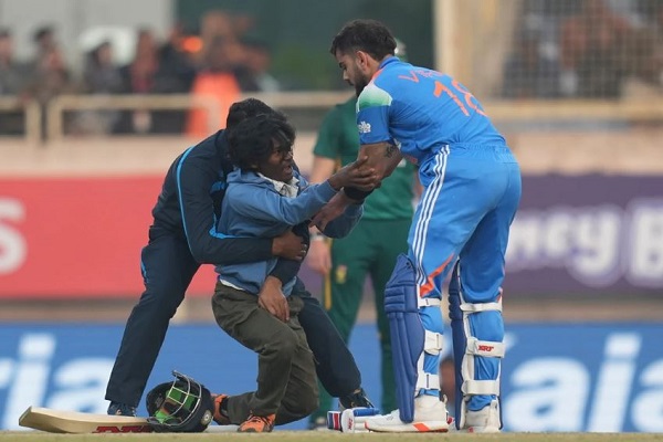 कोहली के शतक पूरा करते ही एक प्रशंसक सुरक्षा घेरे को तोड़ते हुए अंदर आ गया, वह घुटने के बल उनके सामने बैठ गया और उनके पैर छुए, जिसके बाद सुरक्षाकर्मियों ने उसे बाहर किया। कोहली अंततः 43वें ओवर में नार्दे बर्गर (2-65) के शिकार बने। वहीं राहुल व जडेजा ने छठे विकेट के लिए सिर्फ 36 गेंदों पर 65 रनों की तेज साझेदारी से दल को 350 के लपेटे में पहुंचा दिया। कोर्बिन बॉश व ओडनिल बार्टमैन ने भी दो-दो विकेट लिए।
