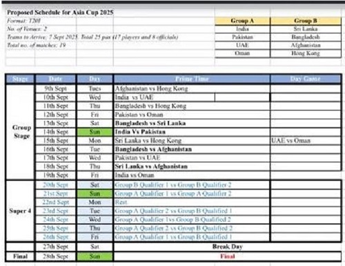 दिलचस्प यह है कि दो चिर-प्रतिद्वंद्वी टीमों – भारत व पाकिस्तान को एक ही ग्रुप में रखा गया है और लीग चरण में उनकी मुलाकात 14 सितम्बर को होगी। वैसे, दोनों टीमों के बीच संभावित रूप से तीन मुकाबले होंगे – एक बार लीग चरण में, फिर सुपर 4 राउंड में और फिर संभवतः फाइनल में।