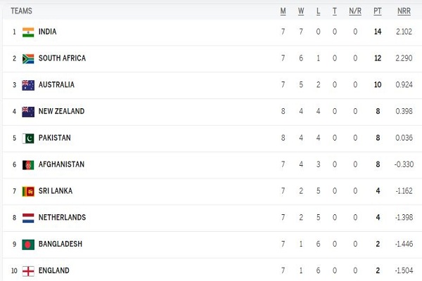 वहीं सात मैचों में लगातार छठी हार के बाद फिसड्डी इंग्लैंड की, जो अब तक अपने दूसरे मैच में सिर्फ बांग्लादेश को हरा सका है, स्पर्धा से विदाई पर अंतिम मुहर लग गई क्योंकि नीदरलैंड्स (8 नवम्बर) व पाकिस्तान (11 नवम्बर) के खिलाफ बचे दो मैचों में जीत से वह अब अधिकतम छह अंकों तक पहुंच सकता है जबकि सेमीफाइनल की दौड़ में शामिल न्यूजीलैंड, पाकिस्तान और अफगानिस्तान के पहले ही आठ-आठ अंक हैं।