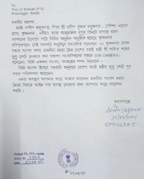 स्थानीय निवासी संदीप मजूमदार ने नदिया जिले के कृष्णानगर स्थित कोतवाली थाने में यह शिकायत दर्ज कराने के साथ उनके खिलफ कड़ी काररवाई की मांग की है। हालांकि तृणमूल कांग्रेस या महुआ मोइत्रा ने अब तक इस मुद्दे पर कोई आधिकारिक प्रतिक्रिया नहीं दी है।