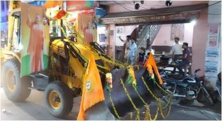 शोभा यात्रा में बुलडोजर को सजाया गया। योगी आदित्यनाथ की तस्वीरें लगाई गईं और योगी आदित्यनाथ का भेष धारण करके एक युवक बुलडोजर के साथ था। उसके दोनों तरफ हनुमान बने दो युवक भी साथ थे। इसके अलावा भगवान राम का दरबार, दुर्गा जी का दरबार, भगवान भोले नाथ, राधा कृष्ण की झांकियां भी निकाली गईं।