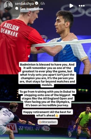 विश्व रैंकिंग में 11वें नंबर पर काबिज लक्ष्य ने इंस्टाग्राम पर पोस्ट किया, ‘बैडमिंटन आपके जैसे खिलाड़ी को पाकर धन्य है और आपको इस खेल के महानतम खिलाड़ियों में से एक के रूप में याद रखेगा। जो चीज आपको वास्तव में सबसे अलग बनाती है, वह यह है कि आप एक बहुत अच्छे इंसान हैं। आपको भविष्य के लिए शुभकामनाएं।’