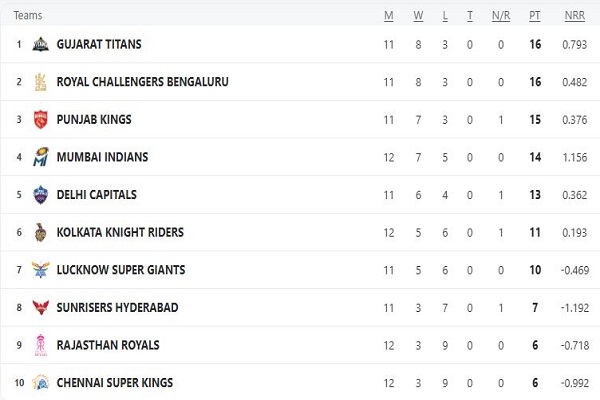 अंक तालिका में छठे स्थान पर काबिज केकेआर के अब 12 मैचों में पांच जीत से 11 अंक हैं और बचे दो मैचों में वह अधिकतम 15 अंकों तक जा सकता है जबकि शीर्ष पांच टीमों के खाते में पहले ही 16 से लेकर 13 अंक हैं और मुंबई इंडियंस को छोड़ अन्य चार को अभी तीन-तीन मैच भी खेलने हैं।