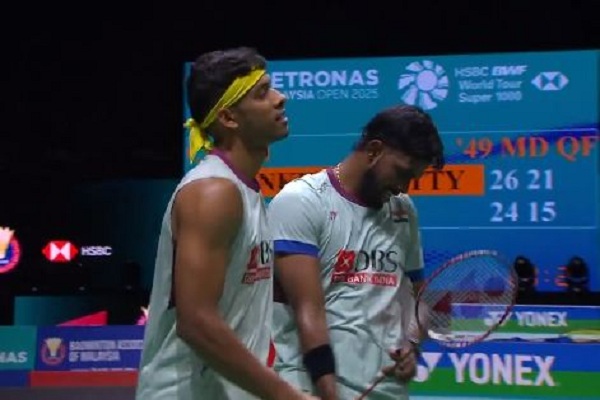 BWF विश्व रैंकिंग में नौवें स्थान पर काबिज और यहां एक्सियाटा एरेना में सातवीं सीड लेकर उतरे सात्विक व चिराग ने शुक्रवार को क्वार्टर फाइनल में स्थानीय चुनौतीकर्ता मलेशिया के यू सिन ओंग व ई यि तियू को 26-24, 21-15 से हराया। भारतीय जोड़ी का फाइनल में प्रवेश के लिए शनिवार को दक्षिण कोरियाई वोन हो किम व सियुंग जाए सियू से मुकाबला होगा।
