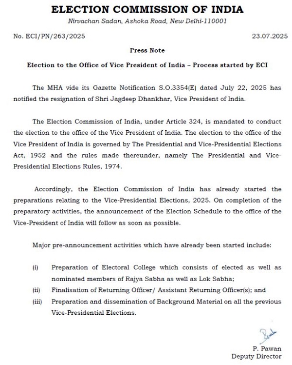 नई दिल्ली, 23 जुलाई। मानसून सत्र के पहले दिन उप राष्ट्रपति जगदीप धनखड़ के अचानक इस्तीफे के बाद भारत निर्वाचन आयोग (ECI) एक्शन मोड में आ गया है और उसने उप राष्ट्रपति के चुनाव की तैयारी शुरू कर दी है। EC की ओर से आज जारी एक प्रेस विज्ञप्ति में यह जानकारी दी गई।