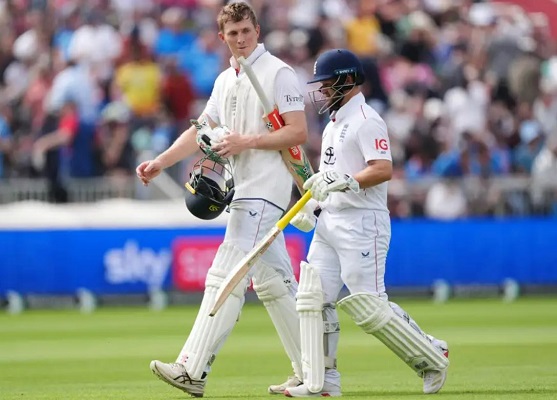 फिलहाल खेल के अंतिम घंटे में भारतीय गेंदबाजों ने इन दोनों आक्रामक बल्लेबाजों से छुटकारा पा लिया। जडेजा ने 32वें ओवर में में क्रॉली को स्लिप में राहुल से कैच कराया तो प्रथम प्रवेशी हरियाणवी पेसर अंशुल कंबोज ने डकेट के रूप में पहला टेस्ट शिकार किया। इस 24 वर्षीय पेसर ने 39वें ओवर में डकेट को विकेट के पीछे स्थानापन्न कीपर ध्रुव जुरेल के हाथों कैच कराया (2-197)। हालांकि ओली पोप (नाबाद 20 रन, 42 गेंद, तीन चौके) व जो रूट (नाबाद 11 रन, 27 गेंद, दो चौके) ने बचे आठ ओवरों में दल को अन्य कोई क्षति नहीं होने दी।