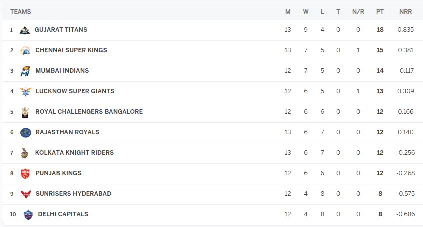 इस जीत के साथ गुजरात टाइटंस 16वें सीजन के प्लेऑफ में पहुंचने वाली पहली टीम बन गई है। उसके 13 मैचों में नौ जीत के बाद 18 अंक हो गए हैं और उसका अंक तालिका की शीर्ष दो टीमों में रहना तय है। वहीं, हैदराबाद (12 मैच, चार जीत, आठ हार, आठ अंक) मौजूदा सीजन से बाहर होने वाली दूसरी टीम बन गई है। उससे पहले दिल्ली कैपिटल्स की चुनौती खत्म हो चुकी है।