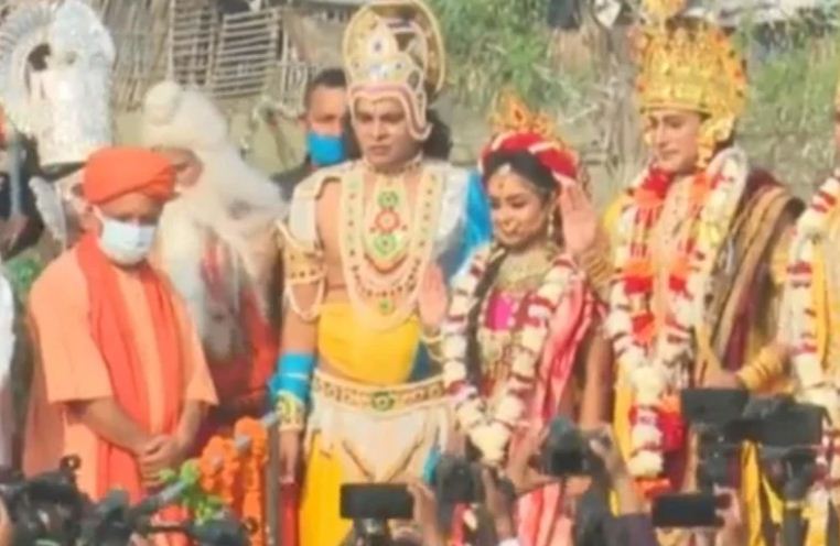 मुख्यमंत्री योगी आदित्यनाथ बुधवार दोपहर अयोध्या पहुंचे, जहां उन्होंने हेलीकॉप्टर स्वरूप पुष्पक विमान से उतरे प्रभु राम, सीता व लक्ष्मण जी का स्वागत किया और फिर उनका राज्याभिषेक किया।