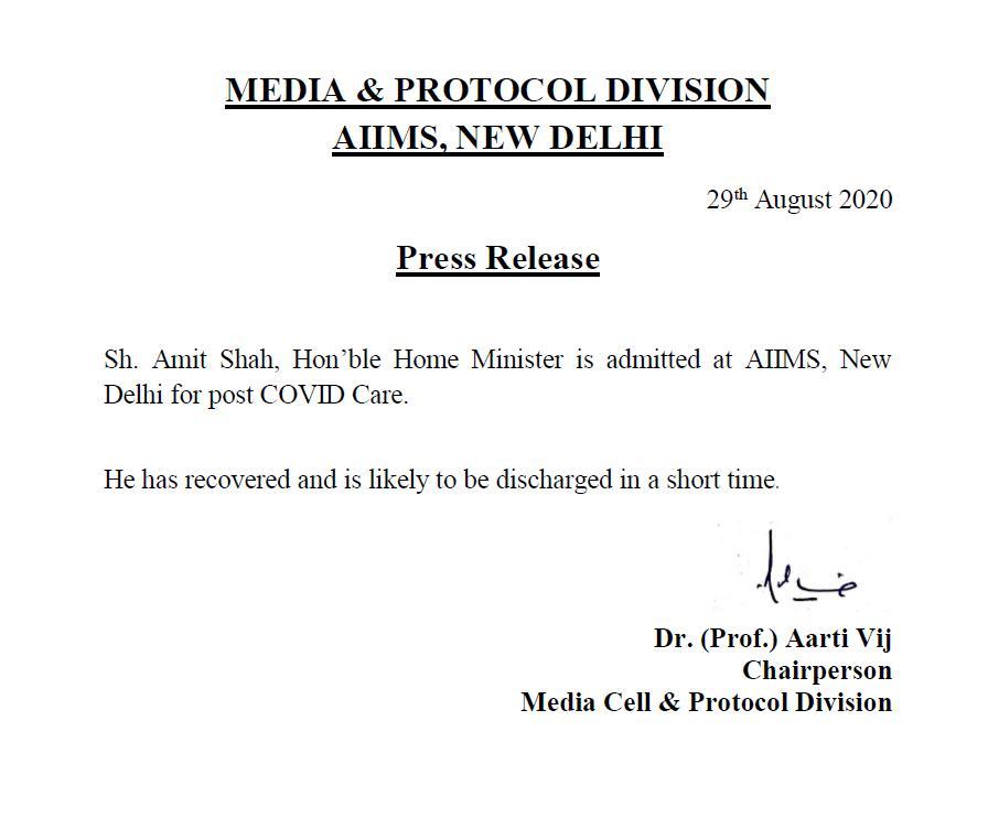 એઈમ્સના ચેરપર્સન આરતી વિજ દ્વારા આ જાણકારી આપવામાં આવી છે અને કહેવામાં આવ્યું છે કે ગૃહમંત્રી અમિત શાહને જલ્દીથી ડિસ્ચાર્જ કરવામાં આવશે.