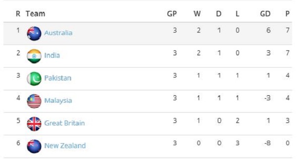 छह देशीय टूर्नामेंट में तीन-तीन मैचों के बाद अजेय ऑस्ट्रेलिया और भारत के बराबर 7-7 अंक हैं। भारत ने पहले दो मैचों में क्रमशः ग्रेट ब्रिटेन को 3-2 और न्यूजीलैंड को 4-2 से शिकस्त दी थी। लेकिन गोल औसत में भारत दूसरे स्थान पर है। पाकिस्तान व मलेशिया के चार-चार अंक हैं। ब्रिटेन ने तीन अंक बटोरे हैं जबकि न्यूजीलैंड का खाता नहीं खुल सका है।