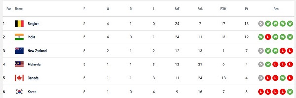 दिन के अन्य मैचों में अग्रणी बेल्जियम ने न्यूजीलैंड को 5-1 से शिकस्त दी तो कोरिया ने मेजबान मलेशिया को 4-3 से हरा पहली जीत हासिल की। अंक तालिका में बेल्जियम ने चार जीत व एक बराबरी से सर्वाधिक 13 अंक बटोरे तो भारत चार जीत व एक हार से 12 अंक लेकर दूसरे स्थान पर रहा। न्यूजीलैंड (सात अंक),मलेशिया (चार अंक), कनाडा (चार अंक) व कोरिया (तीन अंक) क्रमशः तीसरे से स्थान पर रहे।