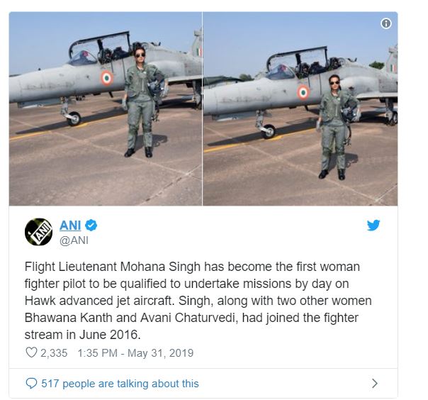 ભારતીય વાયુસેનાના ફ્લાઈટ લેફ્ટિનેન્ટ મોહનાસિંહ પહેલા એવા મહિલા ફાઈટર પાયલટ બન્યા છે, જે દિવસે હૉક એડવાન્સ જેટમાં મિશનને અંજામ આપવામાં કાબેલ છે. મોહનાસિંહને બે મહિલા ફાઈટર પાયલટ ભાવના કંઠ અને અવની ચતુર્વેદી સાથે જૂન – 2016ના રોજ ફાઈટર પાયલટ પ્રશિક્ષણ માટે યુદ્ધ શાખામાં પસંદ કરવામાં આવ્યા હતા.