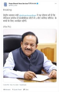 કેન્દ્રીય સ્વાસ્થ્ય મંત્રી હર્ષવર્ધને જાહેરાત કરી છે કે મેડિકલ કોલેજમાં MBBS બેઠકોમાં 5 બેઠકો કોરોના વોરિયર્સના બાળકો માટે અનામત રહેશે. કોરોના વોરિયર્સ એ છે કે જેઓ જમીન પર કામ કરનારા આશા વર્કર્સ અને હૉસ્પિટલમાં કામ કરનારી નર્સ કે ડૉક્ટર છે. તેમના સંતાનો માટે રાષ્ટ્રીય કોટામાં 5 બેઠકો અનામત રાખવામાં આવી છે. મેરિટના આધાર પર તેમનું નામાંકન કરવામાં આવશે.