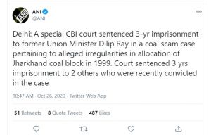 • કોલસા કૌભાંડમાં દોષિત ભૂતપૂર્વ મંત્રી સહિત ત્રણને 3 વર્ષની જેલની સજા