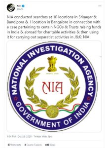 NIA દ્વારા એવો દાવો કરવામાં આવ્યો હતો કે એક પ્રતિષ્ઠિત NGO ધર્મ અને સામાજીક કાર્યોના નામે દેશ વિદેશમાંથી નાણાં મેળવતી હતી અને એ નાણાં આતંકીઓ અને વિભાજનવાદીઓને પૂરા પાડવામાં આવતા હતા.