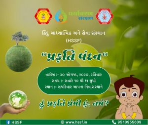 હિંદુ આધ્યાત્મિક અને સેવા ફાઉન્ડેશન(HSSF) અને નૈતિક અને સાંસ્કૃતિક ફાઉન્ડેશન આઈ (IMCTF) ના સંયુક્ત ઉપક્રમે RSSની એક પાંખ પ્રકૃતિ સંવર્ધન માટે સમગ્ર દેશમાંથી ૧૦૦ કેન્દ્રમાં પ્રકૃતિ સર્જનોના આદર માટે 30 મી ઓગસ્ટ, 2020 ના રોજ સવારે 10 થી 11 વાગ્યા દરમિયાન “પ્રકૃતિ વંદન” કાર્યક્રમનું ઓનલાઇન માધ્યમથી આયોજન કરવામાં આવ્યું છે. રાષ્ટ્રીય સ્વયંસેવક સંઘના સરસંઘચાલક માનનીય મોહન ભાગવત કાર્યક્રમ દરમિયાન પર્યાવરણના સંવર્ધન અને સંરક્ષણ માટે લાખો લોકો સાથે ઓનલાઇન માધ્યમથી સંવાદ કરશે.