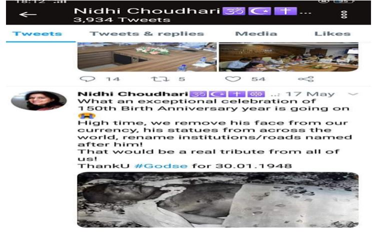 ટ્વિટને હટાવાયા બાદ નિધિ ચૌધરીએ કેટલાક કલાક પહેલા ટ્વિટ કરીને આના સંદર્ભે સ્પષ્ટતા આપી છે. તેમણે કહ્યુ છે કે 17મી મેના રોજ ગાંધીજી પર કરવામાં આવેલી પોસ્ટ હું ડિલિટ કરી રહી છું. કારણ કે કેટલાક લોકો આને ખોટી રીતે લઈ રહ્યા છે. જે લોકો મને વર્ષ – 2011થી ટ્વિટર પર ફોલો કરી રહ્યા છે, તે મારી ગાંધીજી સંદર્ભેની ભક્તિને જાણે છે. હું તેમનું અપમાન કદાપિ કરી શકું નહીં. હું આખરી દમ સુધી તેમનું સમ્માન કરતી રહીશ.