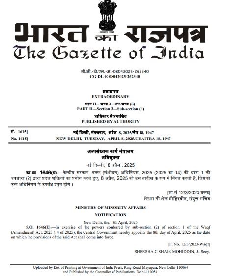 नई दिल्ली, 8 अप्रैल। वक्फ संशोधन अधिनियम पूरे देश में मंगलवार (आठ अप्रैल) से लागू हो गया है। केंद्रीय गृह मंत्रालय की ओर से इसकी अधिसूचना जारी कर दी गई है। केंद्र सरकार की ओर से जारी अधिसूचना में कहा गया है, ‘केंद्र सरकार, वक्फ (संशोधन) अधिनियम, 2025 (2025 का 14) की उप-धारा (2) की धारा 1 द्वारा प्रदत्त शक्तियों का प्रयोग करते हुए, 8 अप्रैल, 2025 को वह तारीख नियुक्त करती है, जिस दिन उक्त अधिनियम के प्रावधान लागू होंगे।’