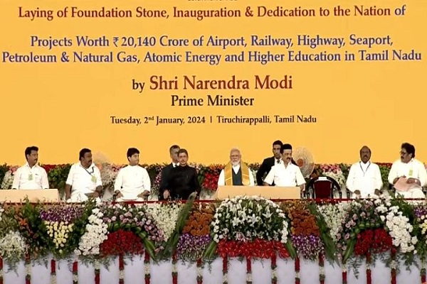 तिरुचिरापल्ली, 2 जनवरी। प्रधानमंत्री नरेंद्र मोदी ने मंगलवार को यहां तमिलनाडु में हवाई और बंदरगाहों, रेलवे, राजमार्ग, पेट्रोलियम और प्राकृतिक गैस, परमाणु ऊर्जा और उच्च शिक्षा से संबंधित 20,140 करोड़ रुपये की लागत से कुल 20 विकास परियोजनाओं का लोकार्पण व शिलान्यास किया।