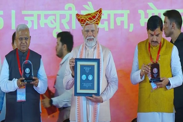 भोपाल, 31 मई। प्रधानमंत्री नरेंद्र मोदी ने शनिवार को भोपाल के जम्बूरी मैदान में आयोजित महिला सशक्तिकरण महासम्मेलन के दौरान लोकमाता देवी अहिल्याबाई होल्कर की 300वीं जयंती पर 300 रुपये का विशेष सिक्का जारी किया। यह सिक्का भारत सरकार के संस्कृति मंत्रालय द्वारा जारी किया गया है और इसमें अहिल्याबाई होल्कर की उभरी हुई छवि है, जो उनकी ऐतिहासिक विरासत को सम्मान देती है। इस विशेष सिक्के की अधिसूचना वित्त मंत्रालय द्वारा जारी की गई है।