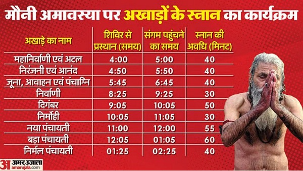 मौनी अमावस्या पर्व पर बुधवार को अखाड़ों के संत एवं नागा संन्यासी 10 घंटे से अधिक समय तक अमृत स्नान करेंगे। सबसे पहले संन्यासी परंपरा के महानिर्वाणी एवं शंभू पंचायती अटल अखाड़ा के संत तड़के 5.00 बजे स्नान करेंगे। इसके लिए संत अपने शिविर से चार बजे प्रस्थान कर जाएंगे। वहीं, आखिरी में निर्मल अखाड़ा के संत दिन में 2.25 बजे से 2.45 बजे तक स्नान करेंगे।