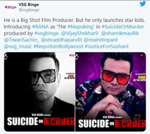 એક પોસ્ટરમાં રાણાનો બ્લેક એન્ડ વાઈટ ફોટો જોવા મળી રહ્યો છે, જ્યારે બીજો ફોટો કલરિંગ છે. પોસ્ટર શેર કરતી વખતે તેમણે કેપ્શનમાં લખ્યું છે કે, ‘તે એક મોટો શોટ નિર્માતા છે, પરંતુ તે ફક્ત સ્ટાર કિડ્સ જ લોંચ કરે છે. રાણા Suicide Or Murder ફિલ્મમાં ‘નેપોકિંગ’ની ભૂમિકા નિભાવશે.
