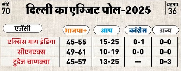 दूसरी तरफ एक्सिस माय इंडिया के एग्जिट पोल के अनुसार भाजपा को 45-55 सीटें मिलने का अनुमान है जबकि आम आदमी पार्टी सिर्फ 15-25 सीटों पर ही सिमट सकती है। कांग्रेस को शून्य से एक सीट का अनुमान जताया गया है। सीएनएक्स के एग्जिट पोल के आंकड़े भाजपा को 49-61 सीटें दे रहे हैं जबकि ‘आप’ के खाते में 10-19 सीटें आ सकती हैं।