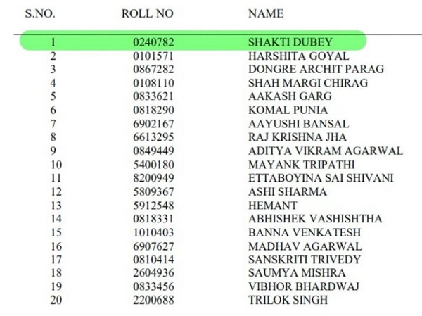 वरीयता सूची में शीर्ष 20 स्थान प्राप्त करने वाले अभ्यर्थी